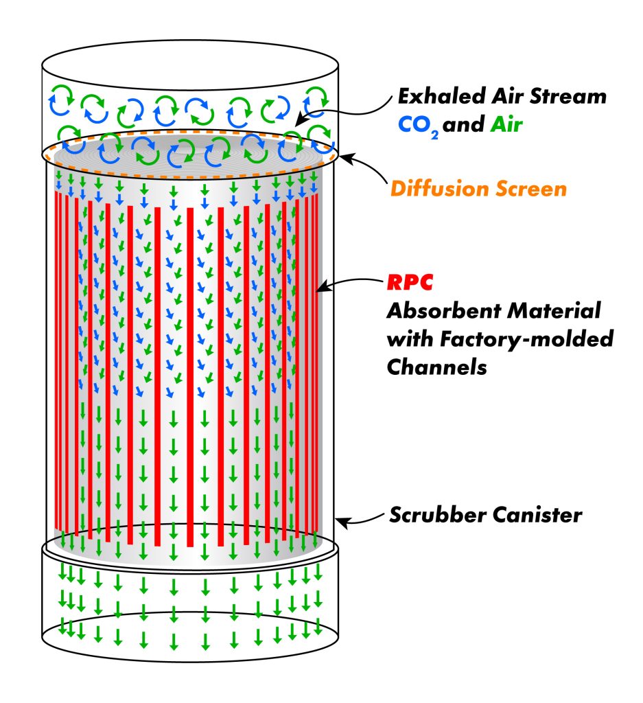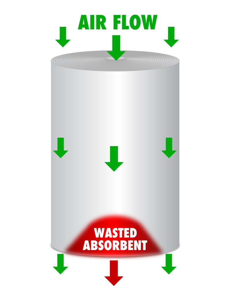 In a granular canister, gases seek the path of least resistance through the bed. The flow pattern can be very random and will certainly vary from person to person. Learning to load a granular canister requires instruction to learn the proper technique. Optimal loading of the canister requires tapping to achieve a uniform bed of granules. This takes time and can cause dusting of the adsorbent. All of this leads to variations in duration, wasted adsorbent and the potential for “caustic cocktail”