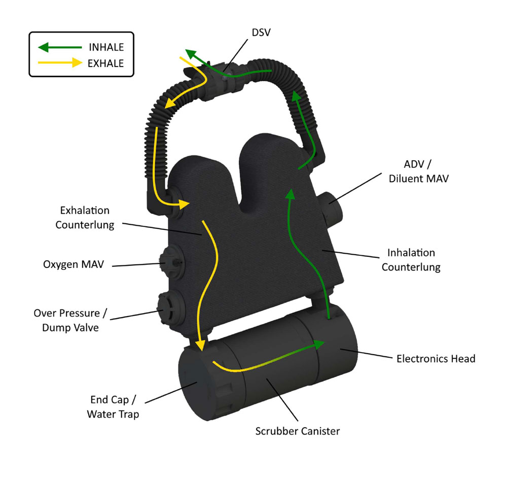 The O2ptima CM incorporates a chest-mounted, dual counterlung design. The breathing loop consists of the DSV, breathing hoses and hose fittings, inhalation and exhalation counterlungs, scrubber canister, canister end cap, and electronics head.